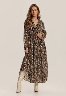 Sukienka Bancroft maxi, z gumką w talii oraz dołączonym, plecionym paskiem z klamrą. Zdobiona wzorem w liście, pod spodem podszewka. Lekko prześwitujące rękawy z mankietem na guzik. Kopertowa góra. Uwaga: dla L oraz XL sugerujemy wybór większego rozmiaru.
