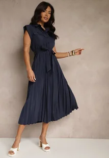 Granatowa Plisowana Sukienka z Bawełną i Paskiem Lireviere