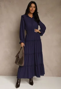 Granatowa Sukienka VICES Koszulowa z Falbaną w Rustykalnym Stylu Arivite
