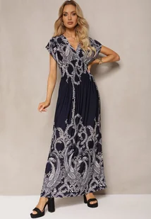 Granatowa Sukienka w Ornamentalny Wzór z Gumką w Talii i Kopertowym Dekoltem Lamera