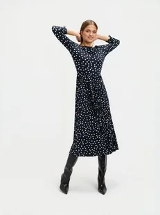 Ta elegancka granatowa sukienka z plisowanym dołem to idealny wybór na wiele okazji. Wykonana z wysokiej jakości materiałów, co zapewnia komfort noszenia i elastyczność. Sukienka jest ozdobiona subtelnym wzorem w kropki, który dodaje jej uroku. Ten model to połączenie klasycznego stylu z nowoczesnym akcentem, idealna do biura, na spotkania czy uroczystości rodzinne. Modelka ma 177 cm.