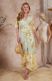 Hope & Ivy Damska sukienka maxi The Ayesha Flutter Sleeve z wiązaną talią na specjalne okazje, Żółty/zielony, 42