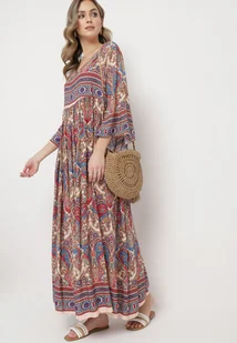 Jasnobeżowa Długa Sukienka Rozkloszowana z Rękawami 3/4 we Wzór Paisley Amarethia