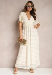 Jasnobeżowa Długa Sukienka z Ażurowej Koronki z Gumką w Talii Gemisa