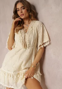 Jasnobeżowa Haftowana Sukienka Mini z Gumką w Pasie i Frędzelkami Maryread