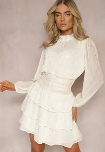 Jasnobeżowa Koktajlowa Sukienka z Falbankami i Błyszczącym Nadrukiem Merrinda