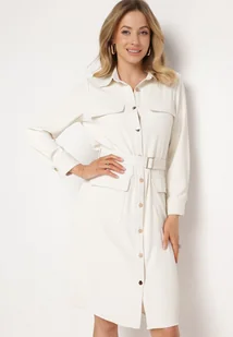 Jasnobeżowa Sukienka Utility o Koszulowym Kroju z Kieszonkami i Paskiem Materiałowym Niobella
