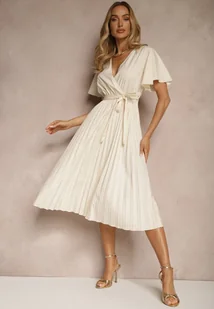 Jasnobeżowa Sukienka Plisowana z Dekoltem w V z Paskiem w Talii Zolseki