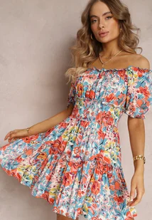 Jasnoniebieska Rozkloszowana Sukienka Mini z Gumkami w Pasie i Krótkimi Rękawami z Wiskozy Merrelle