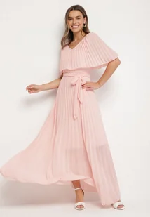 Jasnoróżowa Sukienka Plisowana z Szeroką Falbaną Przy Dekolcie Dinara