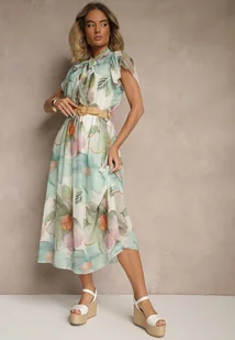 Jasnozielona Rozkloszowana Sukienka Zdobiona Wiązaniem i Paskiem z Klamrą Sorisse