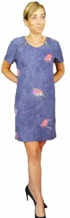 Zwiewna krótka sukienka z wiskozy o strukturze przypominającej jeans, z delikatnymi motywami egzotycznych kolorowych ptakówi chrakterystycznymi dwoma zamkami z przodu oraz jednym z tyłu. Krótkie rękawki. Delikatna, miękka i chłodna w dotyku, znakomita na letnie, cieplejsze dni. . Fason dodający każdej kobiecie elegancji, ale i letniej swobody. Produkt najwyższej jakości, od cenionego polskiego producenta.