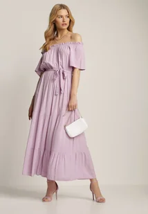 Sukienka Amiphiphae o długości midi i rozkloszowanym kroju. Z gumką w pasie oraz materiałowym paskiem do zawiązania w talii. Z hiszpańskim dekoltem, który możesz nosić także jako łódkę. Z krótkimi rękawami. U dołu ozdobiona delikatną falbaną.