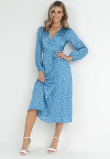 Niebieska Kopertowa Sukienka Midi w Geometryczny Print Zese