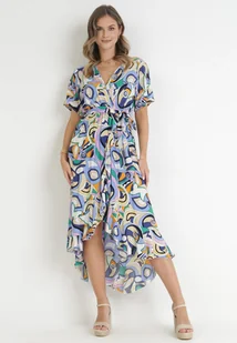 Niebieska Kopertowa Sukienka z Gumką w Pasie i Materiałowym Paskiem z Wiskozy Dionienne