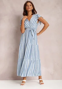 Sukienka Ifamphei długa, o lekko rozkloszowanym kroju, z materiałowym paskiem do podkreślenia talii. Z głębokim, kopertowym dekoltem. Wyposażona w gumkę w talii. Ozdobiona falbankami przy ramionach. Wykonana z wiskozowej tkaniny.
