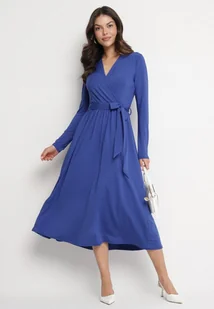 Niebieska Sukienka Kopertowa z Wiskozą Wiązana w Talii Drestalia