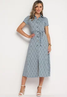 Niebieska Sukienka Taliowana o Koszulowym Kroju Zapinana na Guziki o Geometrycznym Wzorze Parra