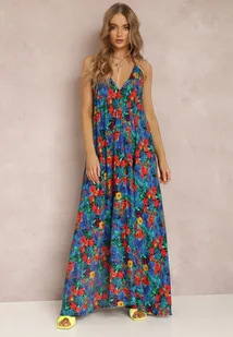Sukienka Thessia z głębokim, trójkątnym dekoltem. Długość maxi, zwiewna, lekko rozkloszowana. Bez rękawów, z cienkimi ramiączkami wiązanymi wokół karku. Na plecach dodatkowe wiązanie na wysokości talii. Pokryta modnym wzorem w duże, intensywnie kolorowe kwiaty.