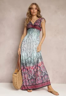 Niebiesko-Różowa Kopertowa Sukienka Maxi z Gumkami w Talii i Ściągaczami na Ramionach Hannele