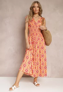 Pomarańczowa Rozkloszowana Sukienka z Wiskozy w Fantazyjny Print Karlene