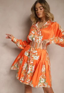 Pomarańczowa Sukienka w Kwiaty o Koszulowym Kroju z Paskiem Alanisia