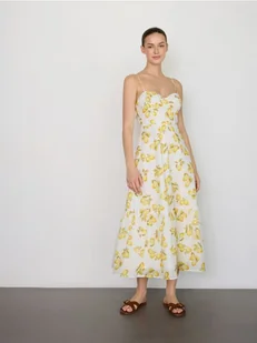 Sukienka o rozkloszowanym kroju, wykonana z bawełnianej tkaniny.