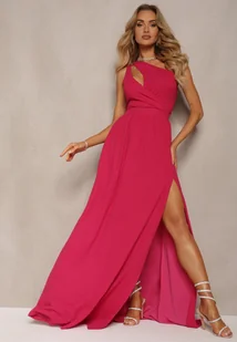 Różowa Rozkloszowana Sukienka Maxi na Jedno Ramię Beliotta