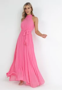 Różowa Plisowana Sukienka Maxi z Gumką w Pasie i Rozkloszowanym Dołem Tehe