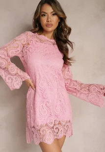 Różowa Pudełkowa Sukienka Mini z Koronkowego Materiału Aima
