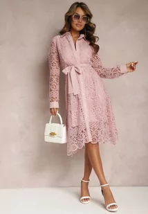 Różowa Koszulowa Rozkloszowana Sukienka Midi z Paskiem i Ozdobną Koronką oraz Guzikami Casuva