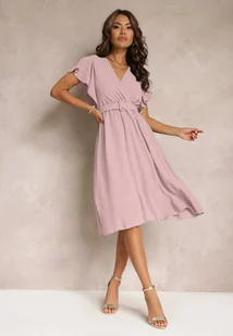 Jasnoróżowa Sukienka z Kopertowym Dekoltem i Paskiem Sizue