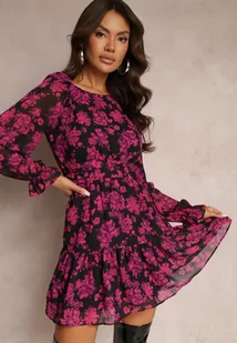 Różowa Sukienka Mini o Rozkloszowanym Fasonie w Kwiaty z Falbankami Mizaja