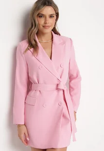 Różowa Marynarka Sukienka z Paskiem w Talii Dwurzędowa z Poduszkami w Ramionach Noreana