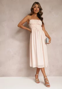 Różowa Rozkloszowana Sukienka Midi na Cienkich Ramiączkach z Wiązaniem w Talii Tessonne