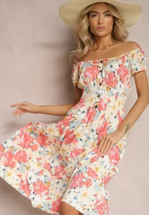 Różowo-Beżowa Wiskozowa Sukienka Midi z Falbanką i Kwiatowym Wzorem Exordia