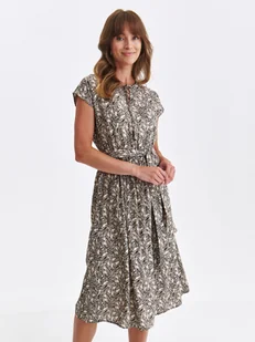 Sukienka damska Top Secret klasyczna o luźnym kroju. Ceniona za pełen prostoty styl oraz duży komfort podczas użytkowania sukienka damska o luźnym kroju i długości za kolano. Posiada ona krótkie rękawy w formie kimono oraz efektowne wiązanie w okolicach dekoltu z przodu. Wykonana ona została z delikatnej oraz przyjemnej w dotyku dzianiny wiskozowej, będąc wzbogaconą o efektowny nadruk z motywami roślinnymi, a uroku dodaje jej praktyczna gumka w talii oraz wiązanie z wykorzystaniem szarfy z tego samego materiału. Jest ona bardzo dobrym wyborem na pełną swobody stylizację w okresie letnim i wakacyjnym.