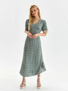 Sukienka damska Top Secret efektowna rozszerzana. Pełna niecodziennej elegancji długa, rozszerzana sukienka damska z krótkimi bufiastymi rękawami zakończonymi cienką tasiemką do ich przewiązywania. Posiada ona dekolt w serek i jest taliowana, z wiązaniem na plecach z wykorzystaniem tasiemki, a uroku dodaje jej nierównomierna długość z lekko dłuższym tyłem. Została ona wykonana z delikatnej w dotyku i trwałej tkaniny wiskozowej, wzbogaconej na całości efektownym nadrukiem z motywem roślinnym. Sukienka dostępna w kolorze zielonym SSU4380ZI.