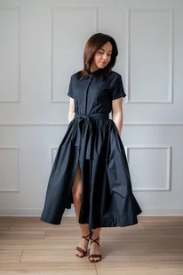 Klasyczna sukienka koszulowa pasująca praktycznie na każdą okazję. Można ją nosić na wiele sposobów, ponieważ świetnie prezentuje się zarówno ze szpilkami jak i z butami sportowymi. Jest odcięta w pasie i posi ...