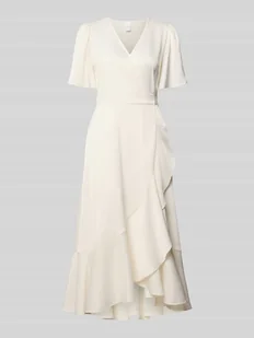 Sukienka midi damska YAS;Elastyczna mieszanka materiałów;Krój regular fit;Model ‘Thea’;Kopertowy styl;Krótki rękaw;Obszycie falbanami;Długość tyłu w rozmiarze 36: 120 cm;Szerokość klatki piersiowej w rozmiarze 36: 45 cm;Długość rękawa w rozmiarze 36: 28 cm