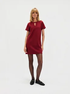 Ta elegancka sukienka z imitacji zamszu w kolorze bordowym to idealny wybór na każdą okazję. Klasyczny krój z krótkimi rękawami i delikatnym wycięciem przy dekolcie dodaje subtelności i szyku.