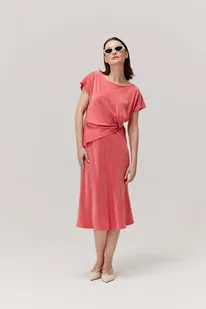 luźny krój midi z efektownym wiązaniem w talii. Opis produktu: krótki, swobodny rękaw, zapewniający komfort noszenia,