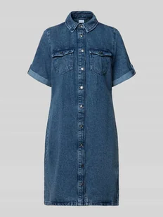 Sukienka denimowa damska od Tommy Jeans;Wygląd: denim;krój: taliowany;Długość: długość mini;Aplikacja: wyhaftowane logo;Zapięcie: listwa guzikowa;rękaw: krótki rękaw;Kieszenie: kieszenie na piersi;Materiał: czysta bawełna