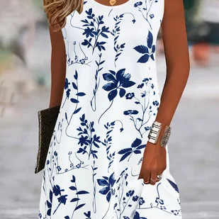 TEMU Stylowa letnia sukienka plażowa damska bez rękawów z kwiatowym nadrukiem i okrągłym dekoltem, elegancka odzież damska