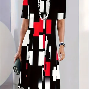 TEMU Elegancka Sukienka Damska z Krótkim Rękawem i Okrągłym Dekoltem na Wiosnę, i Jesień – Dopasowana Sukienka z Geometrycznym Wzorem, Idealna na