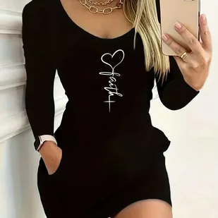 TEMU Kobieca Seksowna Sukienka Obcisła z Długim Rękawem z Napisem "Faith" i Nadrukiem - Poliester do Prania w Pralce, Okrągły Dekolt, Od Wiosny po