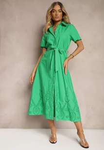 Zielona Bawełniana Sukienka o Ażurowym Wykończeniu z Paskiem w Talii Zapinana na Guziki Dimosha