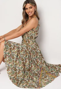 Zielono-Beżowa Rozkloszowana Wiskozowa Sukienka Bez Rękawów Eladea