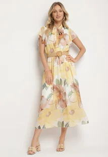 Żółta Sukienka o Rozkloszowanym Kroju z Wiązaniem przy Dekolcie i Paskiem Sorilina