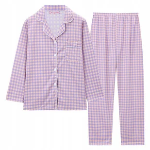 - damska piżama dwuczęściowa; rozpinana koszula i spodnie; luźna, wygodna, nie krępująca ruchów, koszula z dekoltem w serek i z wykładanym kołnierzykiem, zapinana na guziki, na piersi posiada naszytą kieszeń.